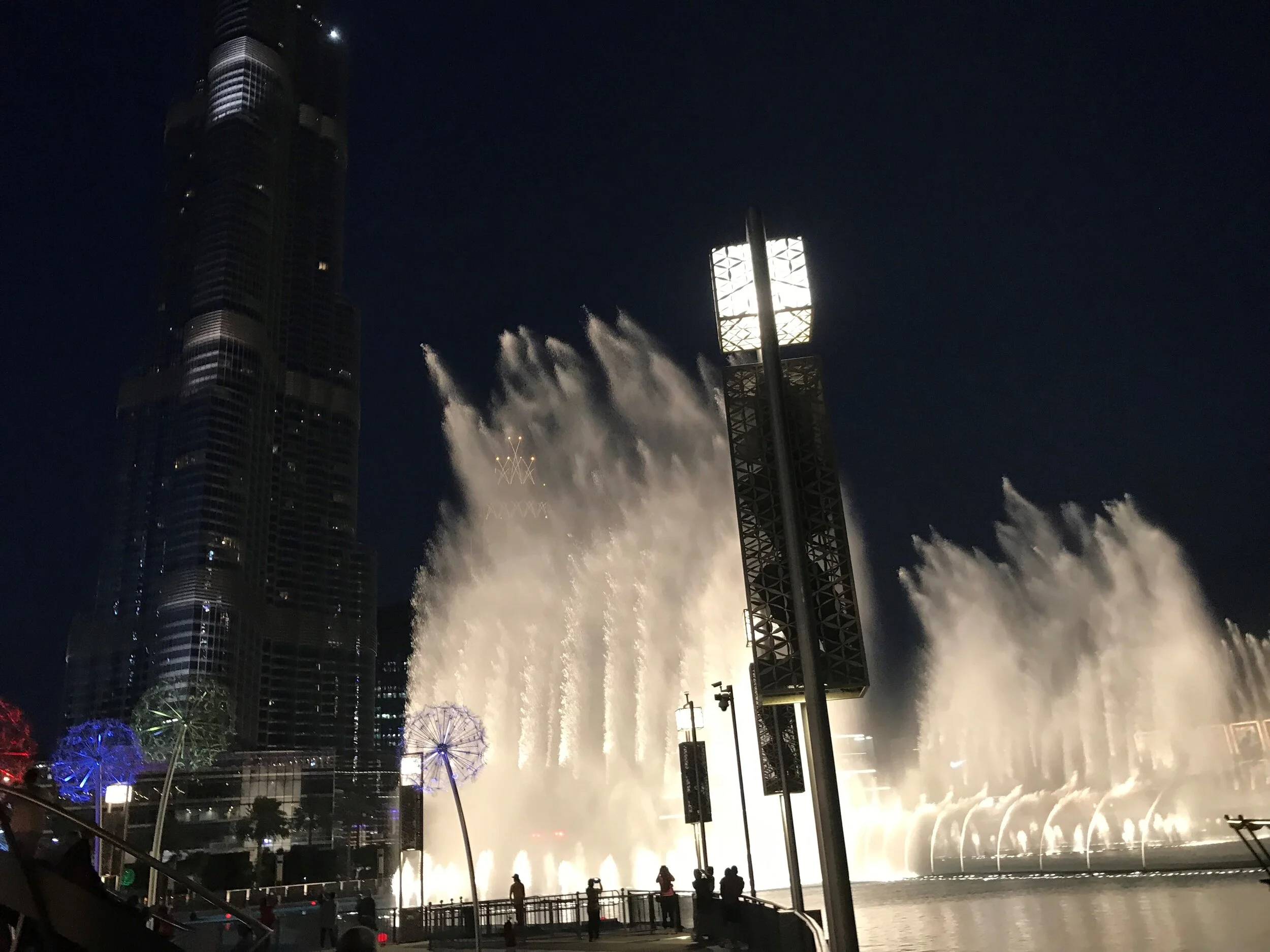 Tritt man aus der Dubai Mall heraus, steht man direkt vor dem größten Springbrunnen der Welt: Hier finden jeden Tag die berühmten, mit Musik unterlegten, Wasserspiele statt. Die Show startet um 18 Uhr im halbstündigen Rhythmus bis 23 Uhr. Die Fontänen tanzen auch nachmittags um 13 Uhr und 13.30 Uhr übers Wasser, jedoch ist das Spektakel nachts definitiv beeindruckender. Tipp: Wer die Fontäne von oben während des Abendessens sehen möchte, sollte sich in eines der Restaurants in der Dubai Mall setzen, die zur Seeseite zeigen.